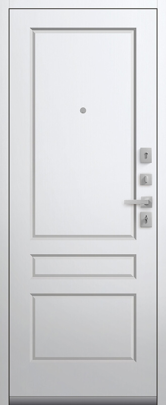Цветовая гамма внутренней панели — седой дуб или белый — позволяет гармонично вписать дверь в любой интерьер. Толщина полотна в 105 мм и глубина короба в 120 мм / 105 мм, в сочетании с наполнением из пенополистирола, гарантируют отличную тепло- и звукоизоляцию. Три контура уплотнения, включая магнитный и трехкамерный уплотнитель, исключают сквозняки и проникновение запахов. Нержавеющий порог обеспечивает долговечность и устойчивость к коррозии.