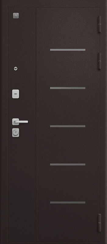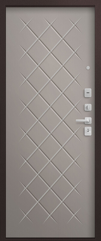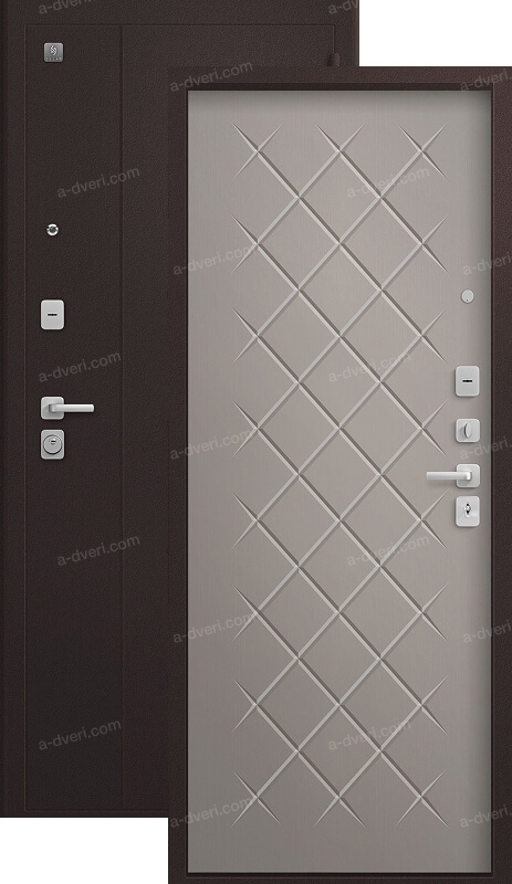 Замки двух типов закрывания — сувальдный SEZAM 103, 3 класса, и цилиндровый SEZAM 102, 4 класса обеспечивают надежную защиту. Также вскрытию воспрепятствуют 3 противосъемных штыря со стороны петель. Цельногнутая многоуровневая конструкция короба делает дверь прочной, безопасной и долговечной. Внутренняя панель — МДФ, толщиной 8 мм, с нейтральной фрезеровкой, позволяет вписать дверь практически в любой интерьер.